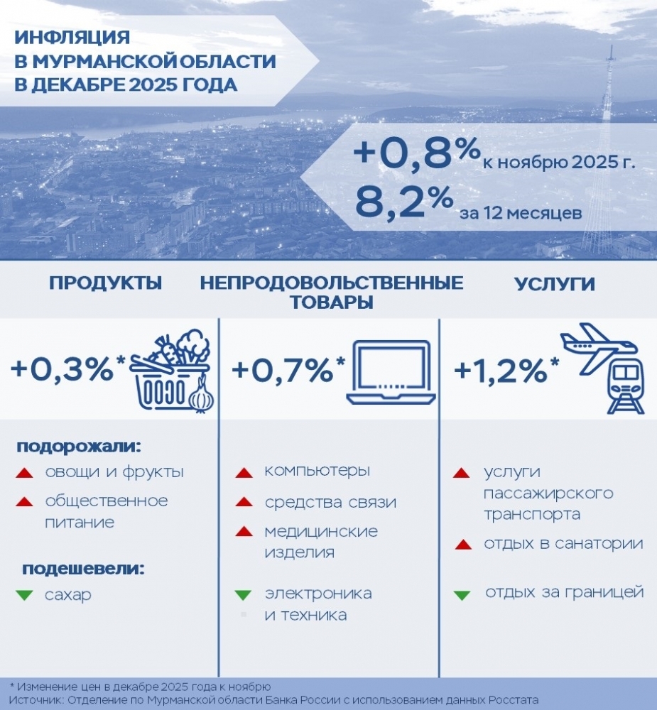 По данным Росстата, цены в Мурманской области в декабре 2025 года по сравнению с ноябрем выросли на 0,8%. При этом годовая инфляция продолжила замедляться и составила 8,2%.